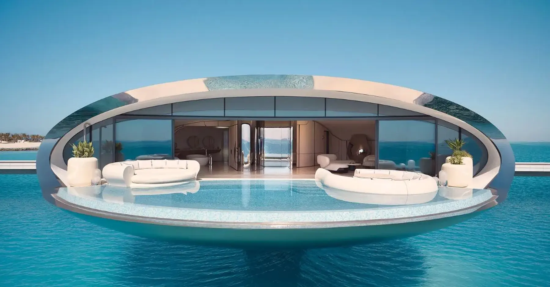 Shebara’s stainless steel villas (pictured top) reflect the sea and sky and seem to float above the water.