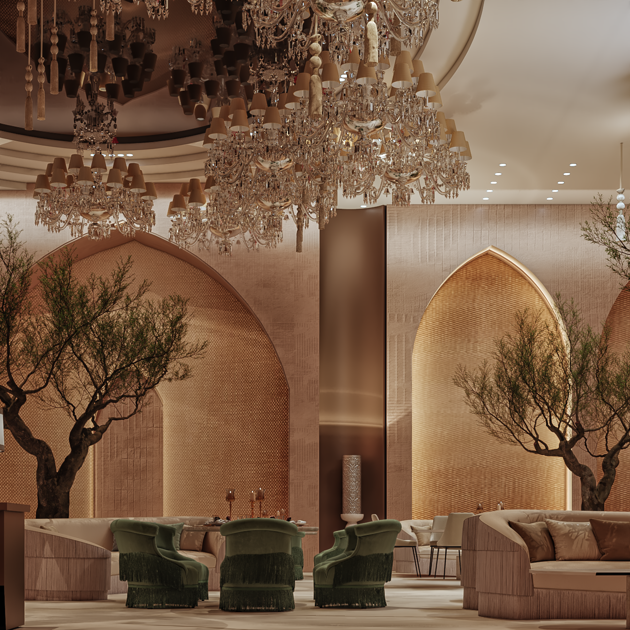 Whether enjoying iftar or suhoor, guests at Amassi can expect majestic arches dressed with shimmering fabrics, cascading chandeliers and handcrafted elements such as embroidered walls and custom cushions created by skilled Moroccan artisans.