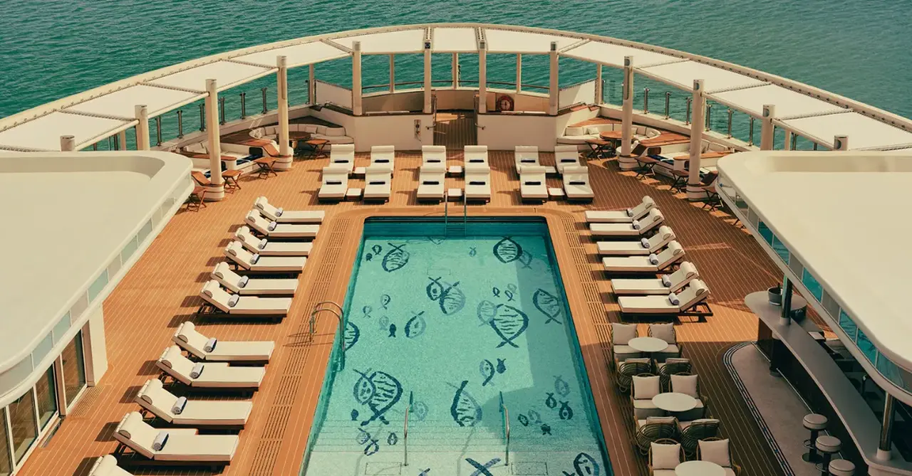 The ship features 95 suites and no interior cabins. Many of the residential-style suites feature large terraces and private plunge pools. The nearly10,000-square-foot Funnel Suite is positioned at the forward-facing prow offering panoramic views. At the opposite end, the almost 8,000-square-foot Loft Suite features an aft-facing terrace.